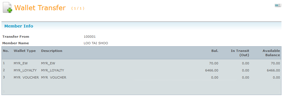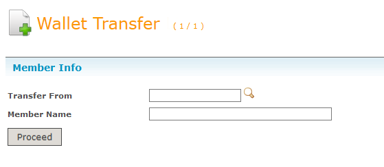 2. Type in a member id you wish to transfer from and click Proceed button. You will see all types of eWallet balance from the transferer. This allow you to check the available balance and only transfer the amount you have.